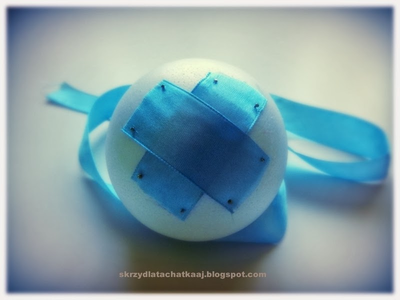 Ze wstążki wycinamy dwa kawałki i przytwierdzamy je do kuli za pomocą szpilek (zdjęcie poniżej)